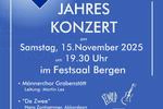 Einladung zum Jahreskonzert am Samstag, den 15. November 2025 um 19:30 Uhr im Festsaal Bergen. Männerchor Grabenstätt (Leitung: Martin Lex), "De Zwee" (Hans Zunhammer, Akkordeon / Adalbert Huber, Gitarre), Gustl Lex (Sprecher) Eintritt 14,00 € / Einlass ab 19:00 Uhr Karten sind erhältlich bei der Tourist Information Bergen Tel: 08662/8321 und an der Abendkasse.